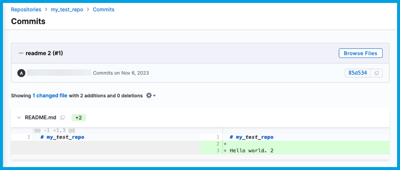 Upon selecting a short SHA, the Commits page opens to the diff view. Here you can compare line-by-line changes in the selected commit, including changes, additions, and deletions.