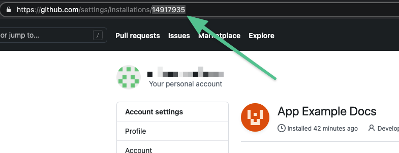Enter the GitHub Installation Id. You can find the installation ID in the URL of your installed GitHub App, such as: