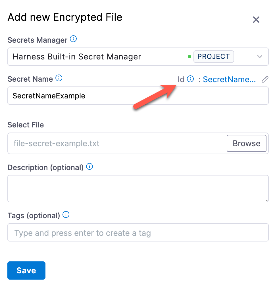 To reference encrypted file secrets in YAML or in fields that require expressions, you must use the ID in a Harness expression.